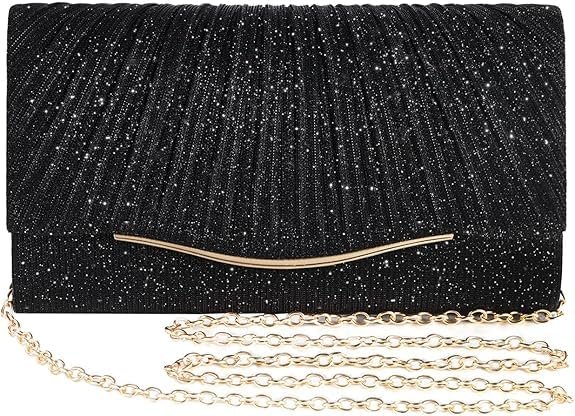 - Fashion Design: Features a stylish clutch silhouette with a glittering finish and sleek metal curve trim, closed securely by a magnetic snap flap, ensuring a chic and eye-catching look.